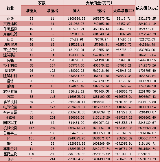 從資金層面看,市場(chǎng)大單資金呈凈流出態(tài)勢(shì),周二,整個(gè)市場(chǎng)資金凈流出金額達(dá)414.30億元。行業(yè)方面,有3類行業(yè)呈凈流入態(tài)勢(shì),分別為:鋼鐵(56117.71萬元)、交通運(yùn)輸(42457.27萬元)、休閑服務(wù)(29046.78萬元)。