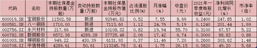 值得一提的是,作為長線資金的社?;鹨蔡崆安季植糠咒撹F股。統(tǒng)計顯示,截至今年一季度末,有6只鋼鐵股獲社?;鸪謧},合計持股市值為26.73億元。具體來看,上述6只鋼鐵股在今年一季度成為社?;鹦逻M增持的重點目標,社?;鹦逻M持有寶鋼股份、八一鋼鐵、永興材料等3只個股,持股數(shù)量分別為11502.58萬股、1710.00萬股、217.66萬股,社?;鹄^續(xù)對新鋼股份、柳鋼股份和中信特鋼等3只個股進行加倉操作,后市表現(xiàn)值得關(guān)注。