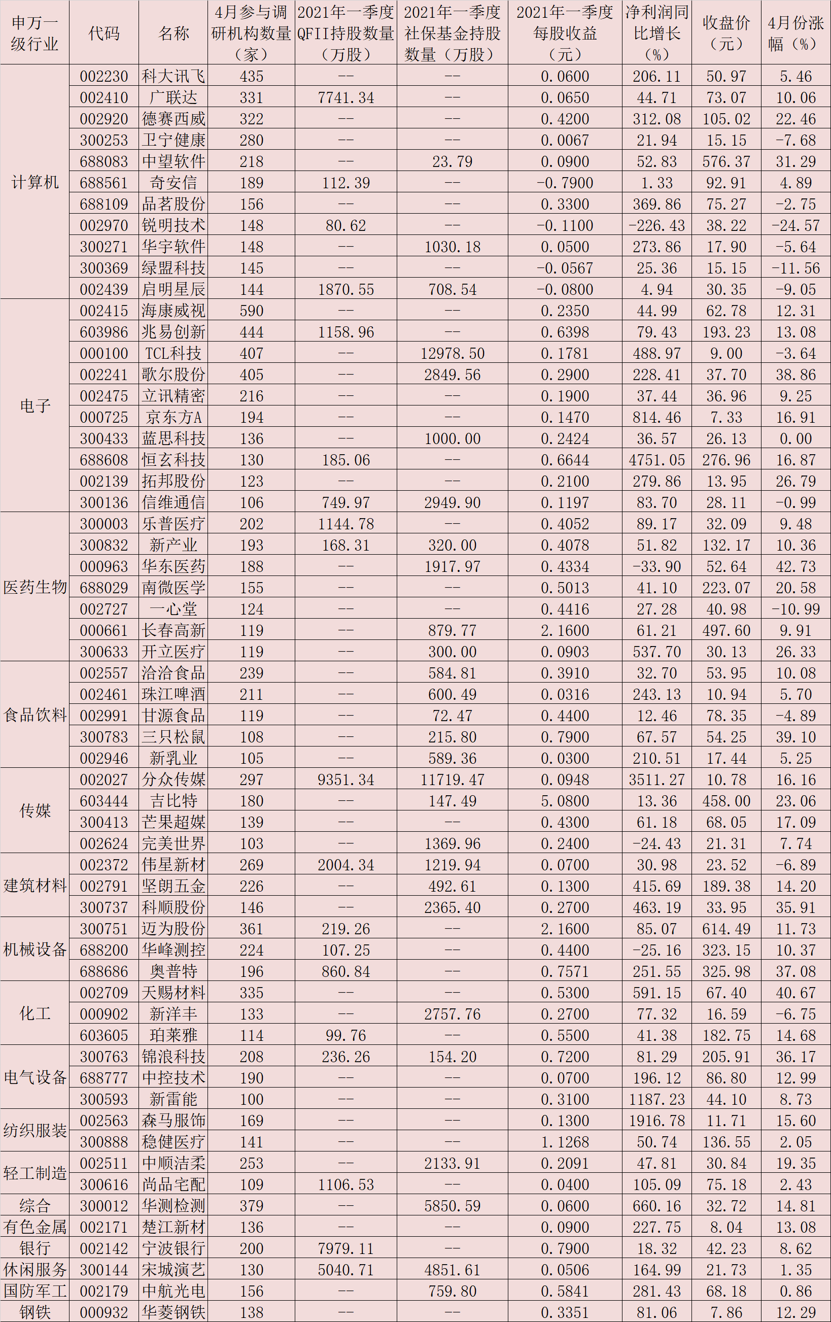 行業(yè)角度方面,上述4月份獲機構調研數(shù)家超100家的59只個股主要扎堆在計算機、電子、醫(yī)藥生物、食品飲料等四行業(yè),涉及個股數(shù)量分別為11只、10只、7只、5只。以計算機及電子為代表的科技類龍頭股依舊是4月份機構調研的重點領域。