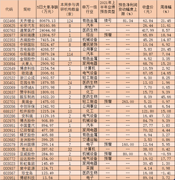 表:上周獲大單資金青睞的機(jī)構(gòu)調(diào)研股