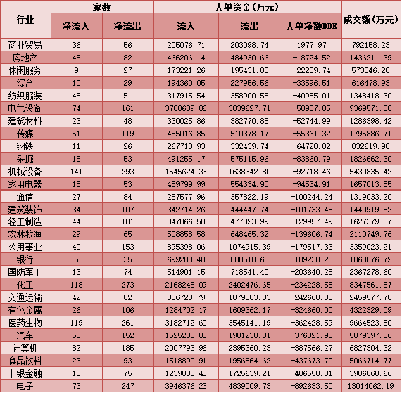 二、周二(6月29日)申萬一級行業(yè)大單資金流向