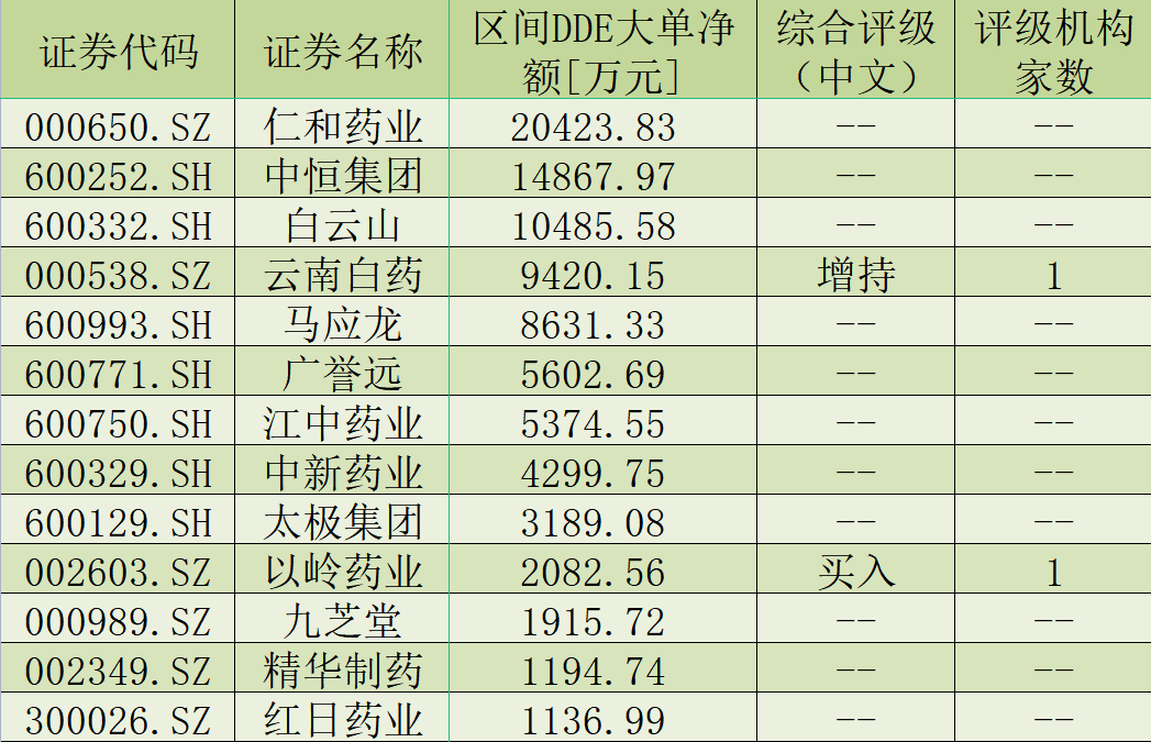 表:近2個交易日中藥板塊大單資金凈流入額過1000萬元個股一覽
