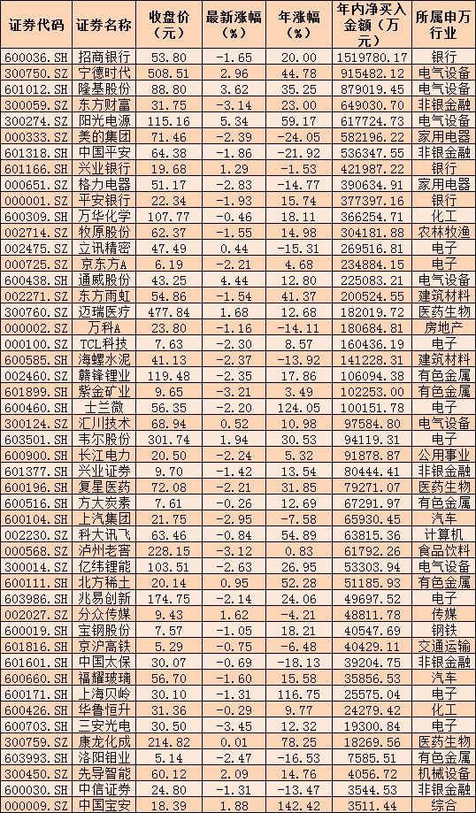 《證券日?qǐng)?bào)》記者根據(jù)同花順統(tǒng)計(jì)發(fā)現(xiàn),從滬股通、深股通前十大成交活躍股來看,今年以來,共有81只個(gè)股現(xiàn)身前十大成交活躍股榜單,48只活躍股處于期間凈買入狀態(tài),北向資金合計(jì)凈買入1063.02億元。其中,招商銀行(151.98億元)、寧德時(shí)代(91.55億元)、隆基股份(87.9億元)、東方財(cái)富(64.9億元)、陽(yáng)光電源(61.77億元)、美的集團(tuán)(58.22億元)、中國(guó)平安(53.63億元)等個(gè)股,年內(nèi)北向資金合計(jì)凈買入額居前,均在50億元以上,多數(shù)為藍(lán)籌股。