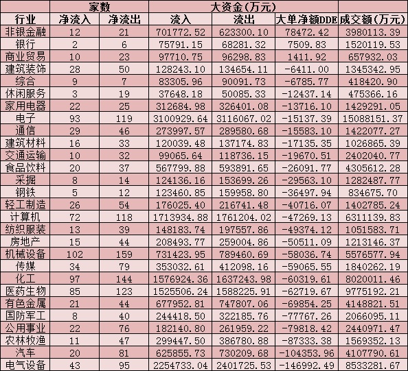 二、周三(6月30日)申萬一級行業(yè)大單資金流向