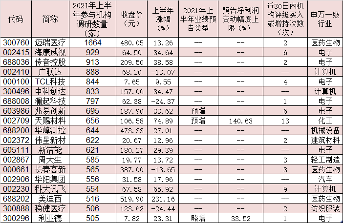 表:上半年獲超500家機(jī)構(gòu)扎堆調(diào)研的公司一覽
