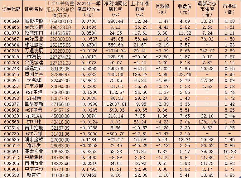 從并購(gòu)重組交易標(biāo)的總價(jià)值來(lái)看,今年上半年并購(gòu)重組交易標(biāo)的總價(jià)值達(dá)到或超過(guò)1億元的房地產(chǎn)公司有27家。其中,城投控股并購(gòu)重組交易標(biāo)的總價(jià)值最高,達(dá)176億元。此外,藍(lán)光發(fā)展、招商蛇口、美好置業(yè)等3家公司今年上半年并購(gòu)重組交易標(biāo)的總價(jià)值也均超過(guò)20億元。