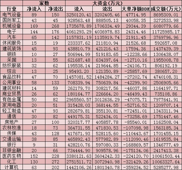 從資金層面看,A股大單資金整體凈流出194.4億元,其中,有1421只個(gè)股呈現(xiàn)資金凈流入,有2863只個(gè)股呈現(xiàn)資金凈流出。從申萬一級的28個(gè)行業(yè)來看,僅有7個(gè)行業(yè)呈現(xiàn)資金凈流入態(tài)勢。其中,電氣設(shè)備和國防軍工等兩個(gè)行業(yè)資金凈流入均超4億元,分別為4.77億元和4.01億元。另外,21個(gè)行業(yè)呈現(xiàn)資金凈流出態(tài)勢,其中,計(jì)算機(jī)、化工、醫(yī)藥生物等三行業(yè),資金凈流出均超20億元。