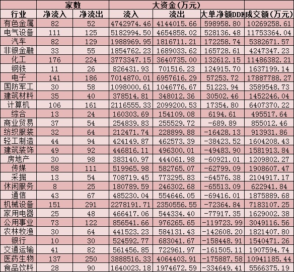 二、周三(7月21日)申萬一級行業(yè)大單資金流向