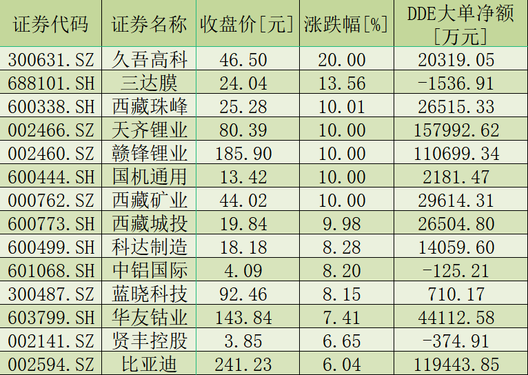 當(dāng)然,鹽湖提鋰板塊的行情也與資金面因素相關(guān)。今日,鹽湖提鋰板塊大單資金凈買入額為56.53億元,共有15只個(gè)股呈現(xiàn)大單資金凈買入狀態(tài),期間合計(jì)凈買入金額達(dá)到57.7億元。具體來看,天齊鋰業(yè)(157992.62萬元)、比亞迪(119443.85萬元)、贛鋒鋰業(yè)(110699.34萬元)3只個(gè)股獲大單資金凈買入額均超10億元;華友鈷業(yè)(44112.58萬元)、西藏礦業(yè)(29614.31萬元)、西藏珠峰(26515.33萬元)、西藏城投(26504.80萬元)、億緯鋰能(23569.89萬元)等個(gè)股獲大單資金凈買入額超2億元。