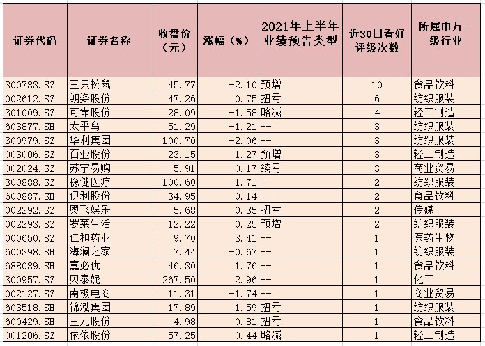機(jī)構(gòu)對(duì)于三胎概念股也表示看好,最近30日內(nèi),有19只個(gè)股獲機(jī)構(gòu)給予“買入”或“增持”等看好評(píng)級(jí),其中,三只松鼠、朗姿股份、可靠股份、太平鳥、華利集團(tuán)、百亞股份、蘇寧易購(gòu)等7只個(gè)股獲得看好評(píng)級(jí)次數(shù)均在3次及以上。