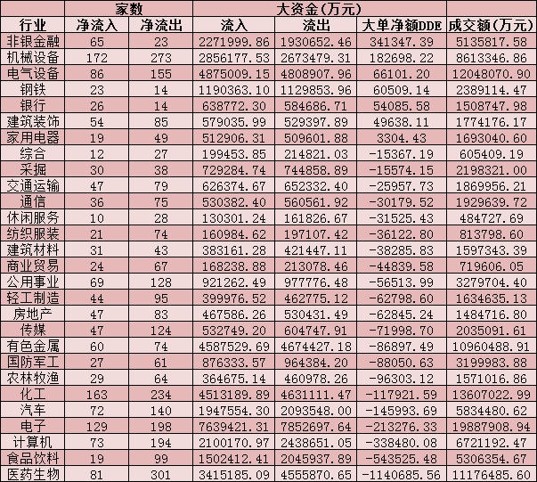 二、周四(7月22日)申萬一級行業(yè)大單資金流向