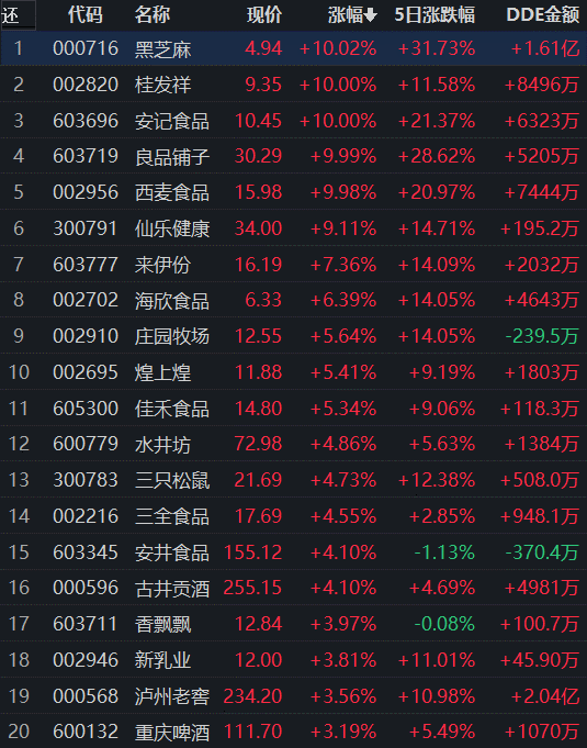食品飲料行業(yè)117只交易個股中,有82只上漲,占比70.09%,其中,有6只個股漲停,11只個股漲幅超5%。其中,西麥食品漲9.98%,報15.98元。該股自8月25日以來,截至8月31日已連續(xù)5個交易日上漲,累計漲幅達20.97%。該股最新A股總市值達35.68億元,A股流通市值35.47億元。