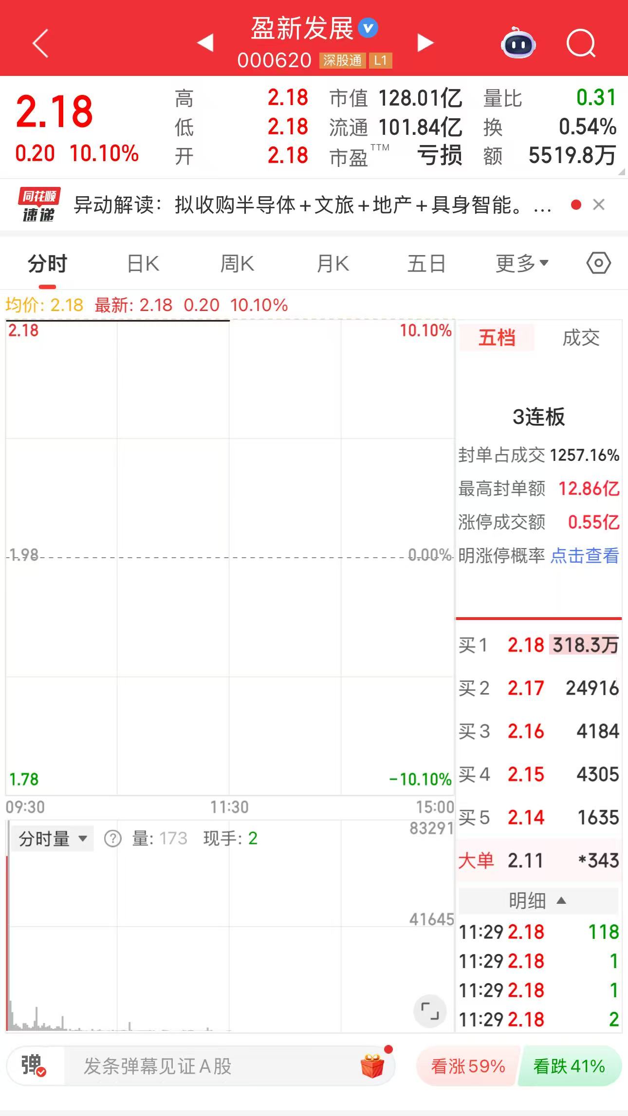 本報(bào)訊 (記者向炎濤)在接連斬獲兩個(gè)漲停板后,10月22日開(kāi)盤,北京銅官盈新文化旅游發(fā)展股份有限公司(以下簡(jiǎn)稱“盈新發(fā)展”,股票代碼:000620)股價(jià)又再次漲停。截至午間收盤,公司股價(jià)報(bào)收于2.18元/股。