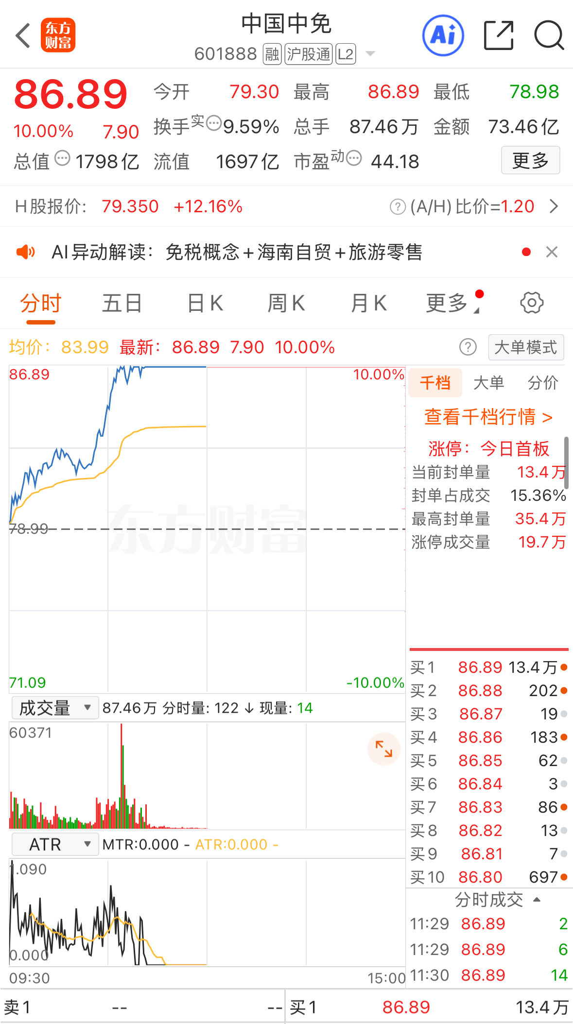 從個(gè)股來(lái)看,歡樂(lè)家“20CM”漲停,三元股份、莊園牧場(chǎng)、惠發(fā)食品、巴比食品、依依股份、東百集團(tuán)等多只大消費(fèi)個(gè)股也集體漲停。此外,千億元市值免稅龍頭中國(guó)中免漲停,截至午間收盤,該股主力凈流入資金居A股之首,獲超10億元主力資金凈流入,買一封單超13萬(wàn)手。
