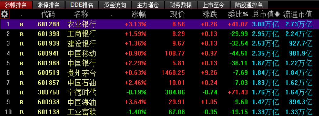 保險、銀行等大金融板塊逆勢走強。農(nóng)業(yè)銀行開盤后持續(xù)拉升,以超過3%的漲幅領(lǐng)漲銀行股,盤中股價再創(chuàng)歷史新高,截至午間收盤,報8.56元/股,總市值達到3萬億元,年內(nèi)累計漲幅超過67%。中國銀行、渝農(nóng)商行、工商銀行等跟漲,漲幅分別為2.29%、1.86%、1.59%。