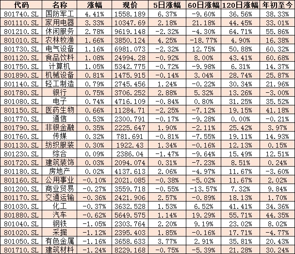 表:周四申萬(wàn)一級(jí)行業(yè)市場(chǎng)表現(xiàn)一覽: