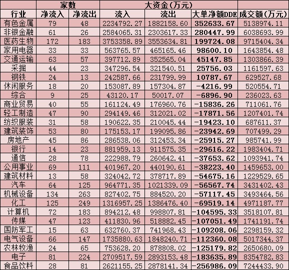 從資金層面看,今日A股大單資金整體凈流出44.35億元,其中,有1490只個股凈流入,2573只個股凈流出。從申萬一級的28個行業(yè)來看,有7個行業(yè)呈現(xiàn)大單資金凈流入態(tài)勢,其中,有色金屬、非銀金融、醫(yī)藥生物等三行業(yè),資金凈流入均超10億元,分別為35.26億元、28.04億元和19.97億元,合計83.27億元。緊隨其后的是家用電器、交通運輸、采掘、鋼鐵等四行業(yè),資金均呈現(xiàn)凈流入態(tài)勢。另外,食品飲料、電子、農(nóng)林牧漁、電氣設(shè)備、國防軍工、傳媒、計算機等行業(yè)資金凈流出均超10億元。