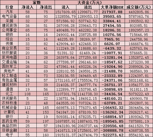 從資金層面看,今日A股大單資金整體凈流出163.19億元,其中,有1387只個(gè)股凈流入,2636只個(gè)股凈流出。從申萬(wàn)一級(jí)的28個(gè)行業(yè)來(lái)看,有9個(gè)行業(yè)呈現(xiàn)大單資金凈流入態(tài)勢(shì),其中,汽車(chē)行業(yè)資金凈流入居首,達(dá)21.79億元,緊隨其后的是電氣設(shè)備、采掘、建筑裝飾等三行業(yè),資金凈流入均超2億元。另外,電子、非銀金融、食品飲料等行業(yè)資金凈流出均超20億元。
