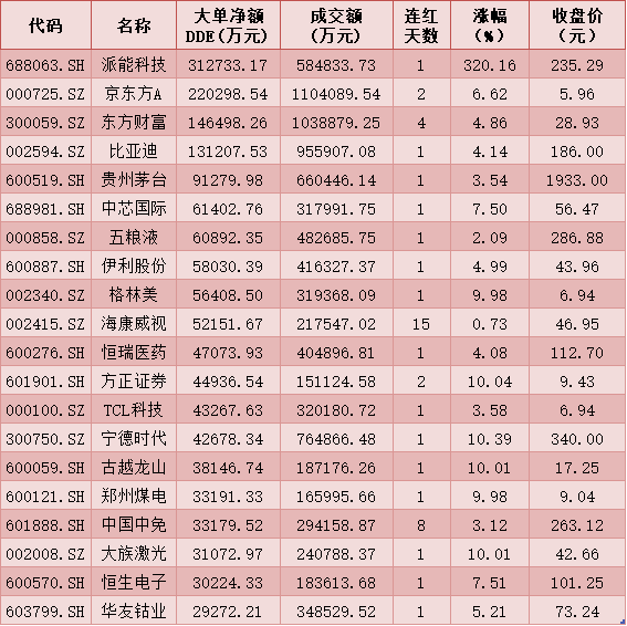 一、周三(12月30日)DDE大單資金凈買入TOP20