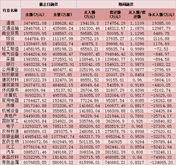 六、截至12月29日申萬一級行業(yè)兩融交易情況
