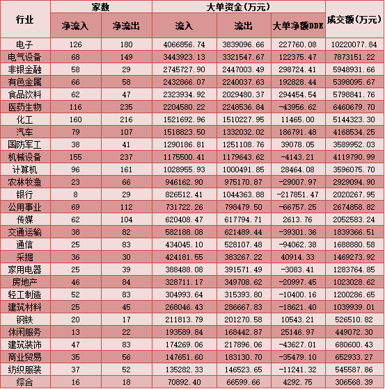 二、周三(12月30日)申萬一級行業(yè)大單資金流向