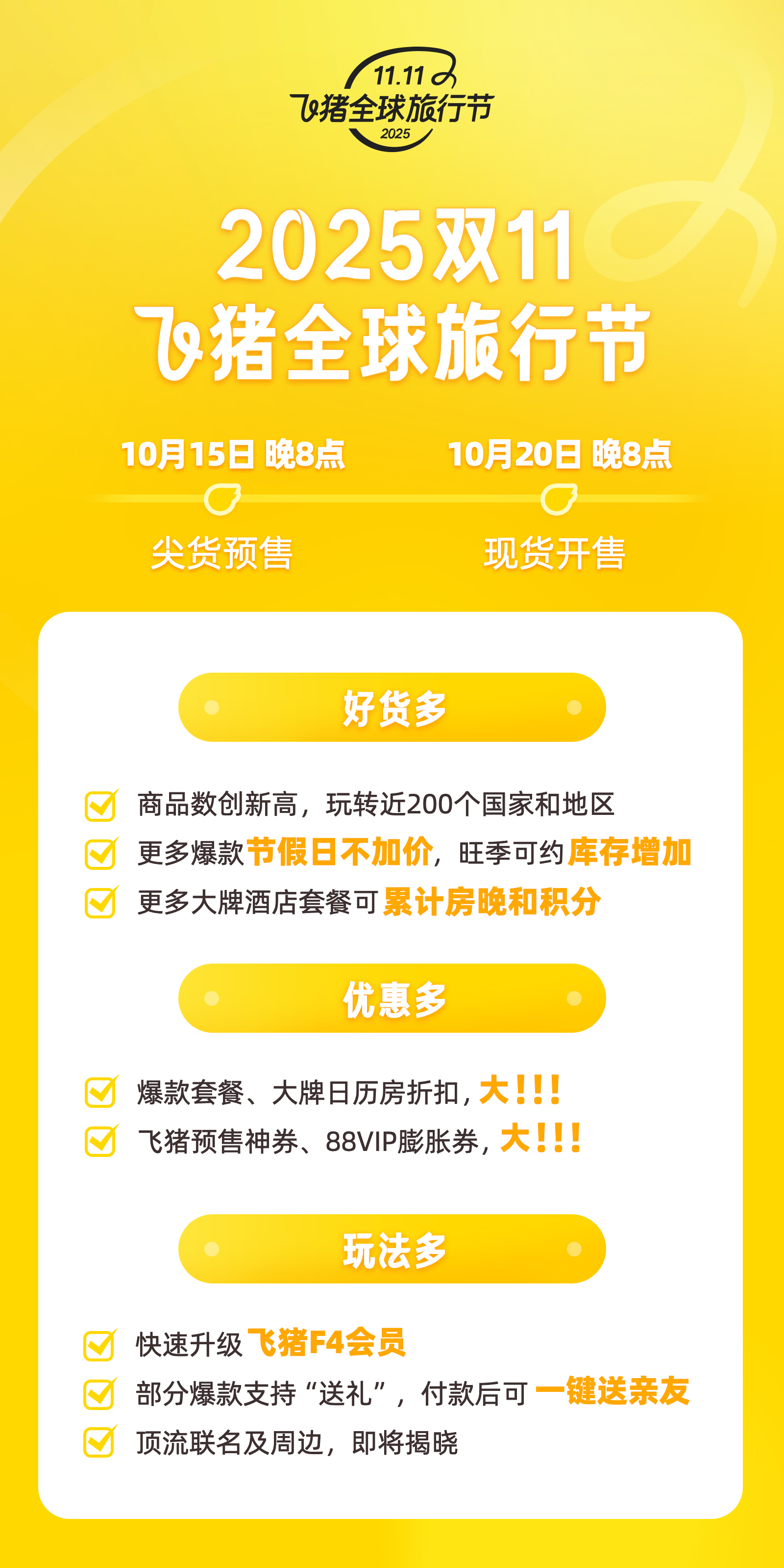 10月15日,飛豬宣布2025年“雙11”全球旅行節(jié)啟動,其中尖貨預(yù)售于當(dāng)日晚8點開始,全量現(xiàn)貨將于20日晚8點開始。