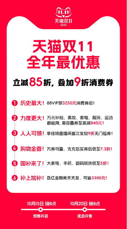 今晚8點(diǎn),天貓“雙11”預(yù)售開(kāi)啟,10月20日晚8點(diǎn),可付尾款,正式現(xiàn)貨開(kāi)賣(mài)。無(wú)門(mén)檻加“疊中疊”,一年最優(yōu)惠時(shí)刻即將來(lái)臨。