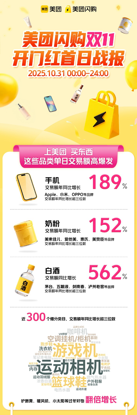 手機、白酒、奶粉等近300類商品銷量同比增長超100%:手機銷量同比增長2倍;白酒銷量同比增長超5倍。大量傳統(tǒng)電商品類和新品類商品在美團閃購“雙11”賣爆:運動相機、黃金、運動鞋服、游戲機、筆記本電腦等銷量同比增長均超10倍。