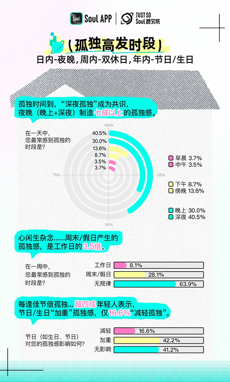 在較長(zhǎng)的一周周期之中,周末/假日產(chǎn)生的孤獨(dú)時(shí)刻是工作日的3.5倍之多;而在年內(nèi),42.2%的年輕人表示節(jié)日/生日會(huì)“加重”自己的孤獨(dú)感,前者是喜氣洋洋的樂景襯托出“作者”的哀情,后者是越長(zhǎng)大越孤單,越長(zhǎng)大越不安.....。