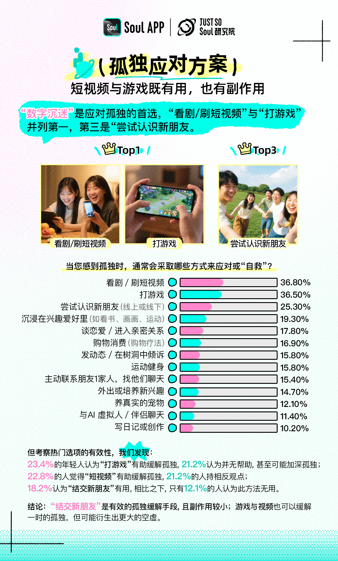 相比之下,有25.3%的年輕人認(rèn)為“認(rèn)識(shí)新朋友”有助于緩解孤獨(dú),且這種方案的“不滿意率”只有12%(相較游戲與短視頻均超過20%)綜合來看,“結(jié)交好友”是有效手段中副作用最小的,因其能直接針對(duì)孤獨(dú)的本質(zhì)——高質(zhì)量社交連接的缺失。